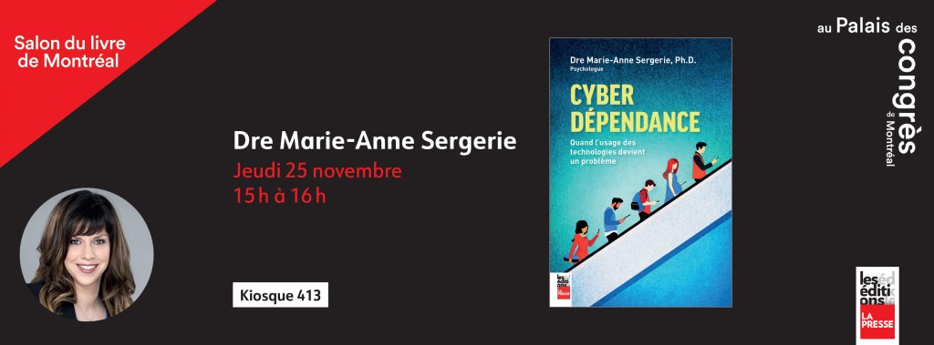 La psychologue Dre Marie-Anne Sergerie sera présente le 25 novembre 2021 de 15h à 16h (kiosque 413) au Salon du livre de Montréal qui se tiendra au Palais des congrès de Montréal. Vous aurez ainsi l’occasion d’échanger avec elle et de faire dédicacer son livre Cyberdépendance : quand l’usage des technologies devient un problème. Venez en grand nombre!