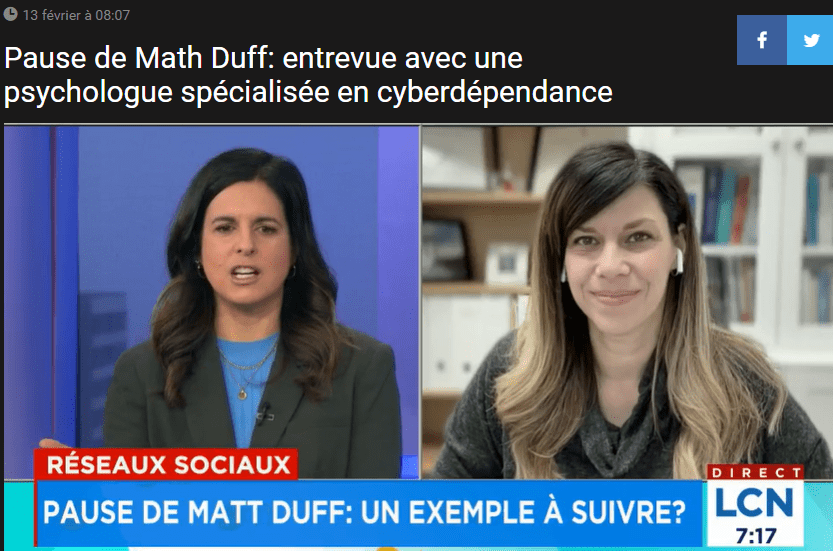 Dre Marie-Anne Sergerie, Ph.D., psychologue spécialisée en cyberdépendance, était en entrevue en direct le 13 février dernier pour l’émission le Québec Matin afin de discuter des effets de prendre une pause des réseaux sociaux. Pour entendre ses propos, cliquez ici!